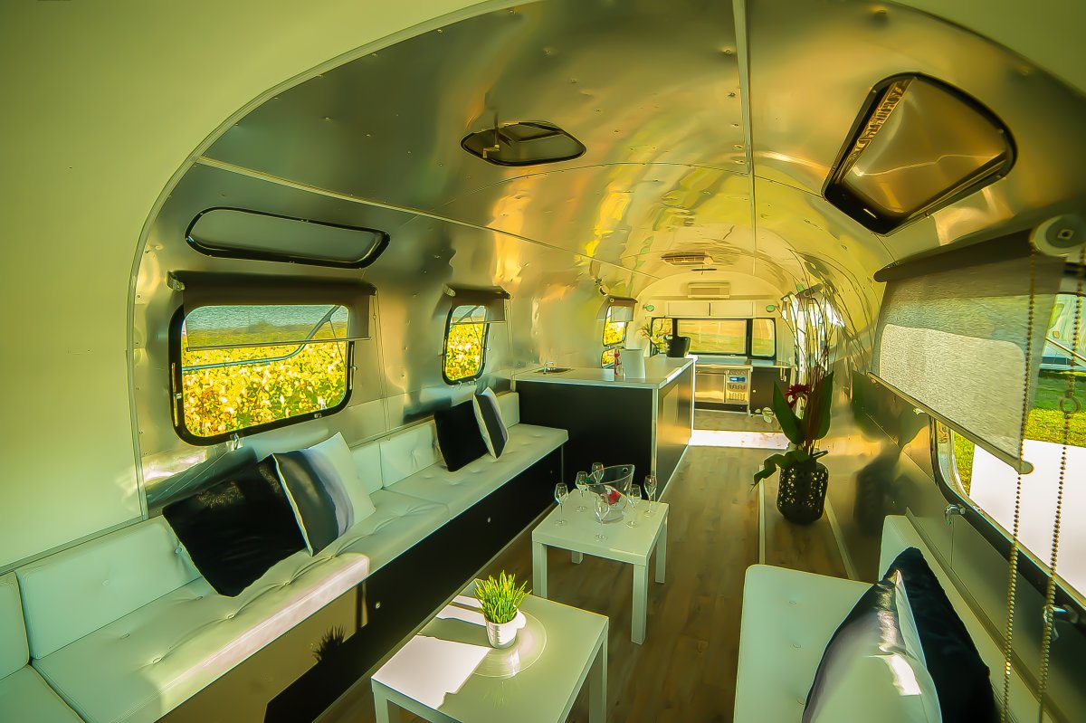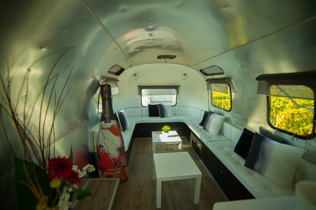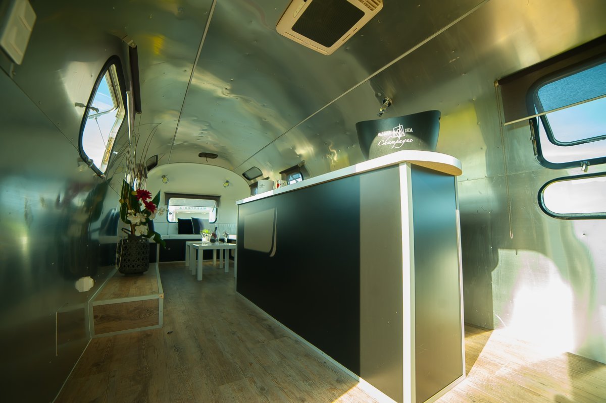 Caravane airstream climatisée et aménagée en bar avec espace détente.