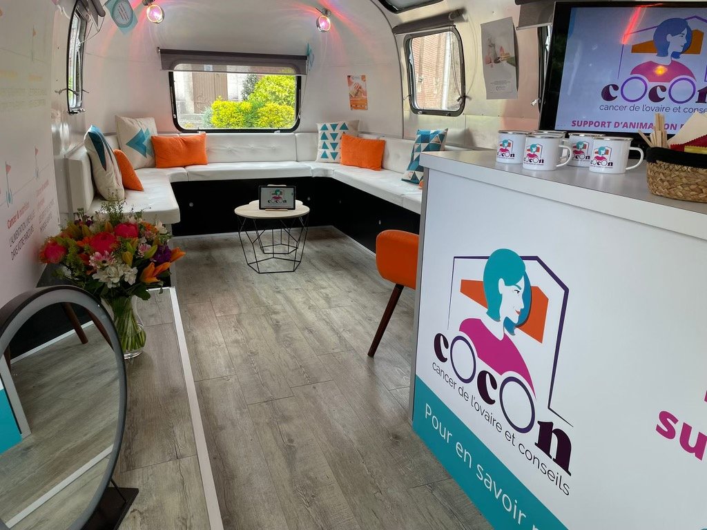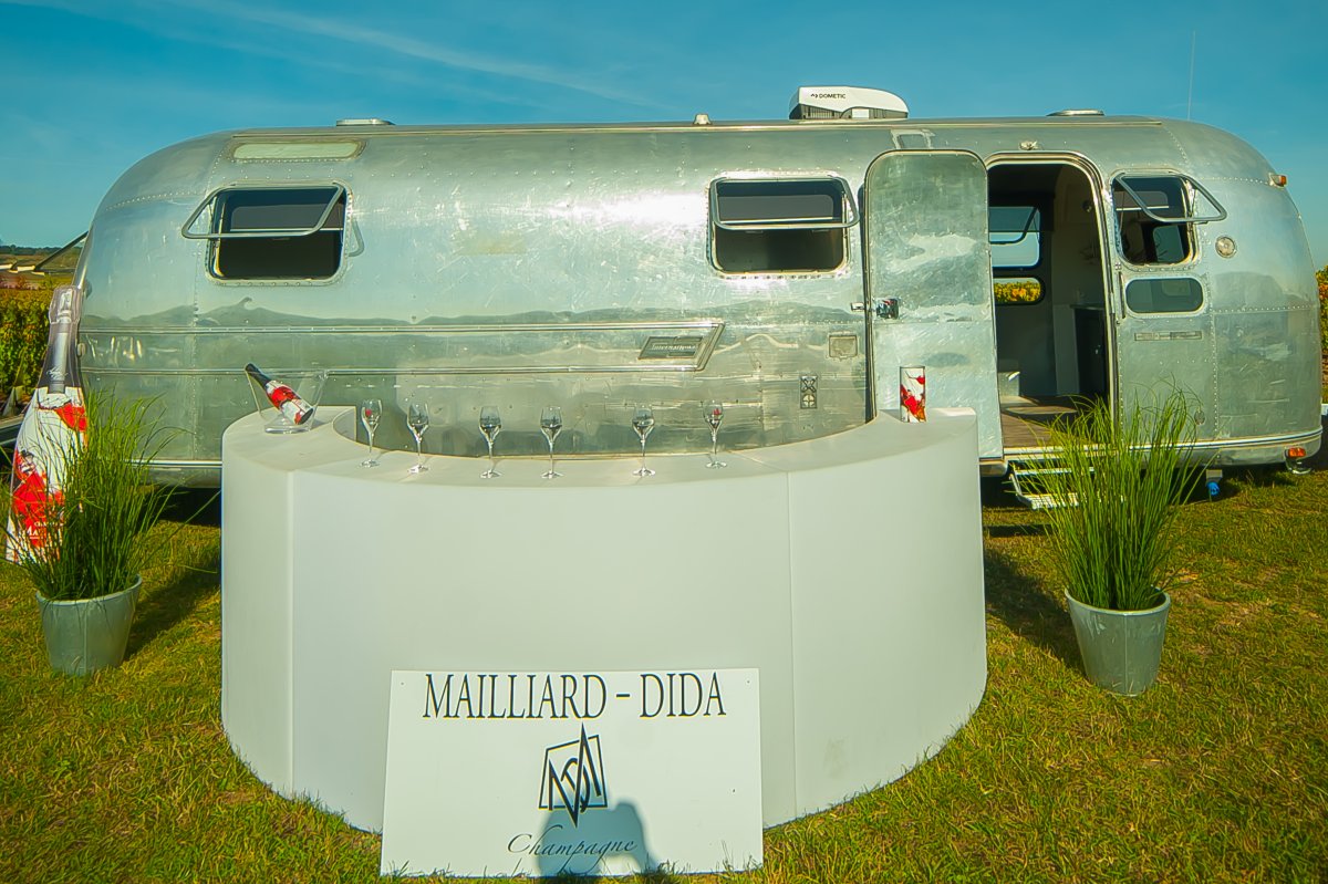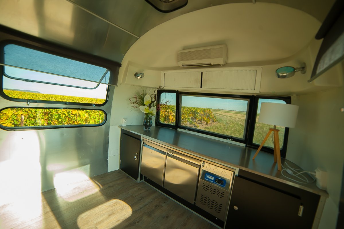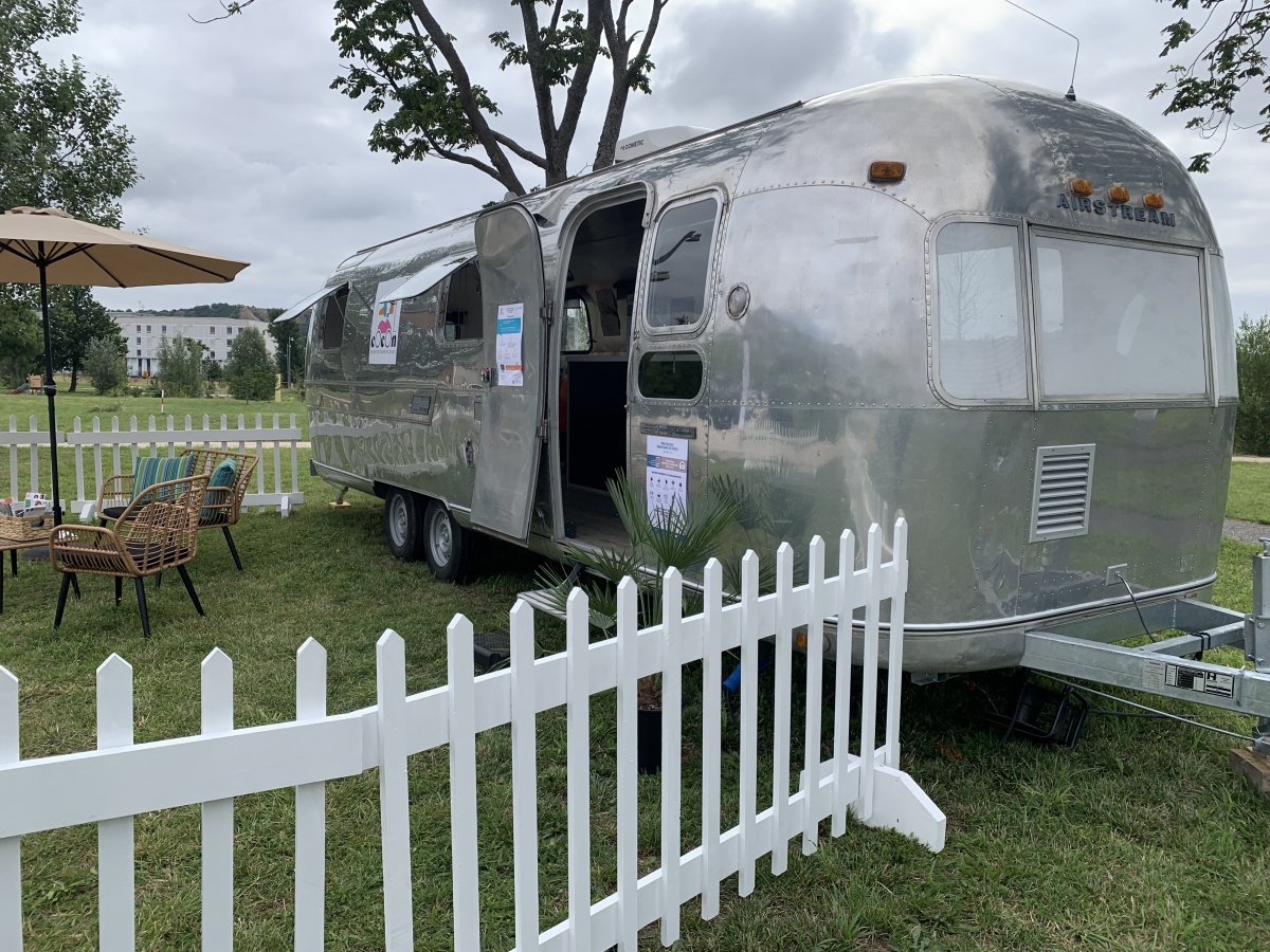 Caravane airstream climatisée et aménagée en bar avec espace détente.